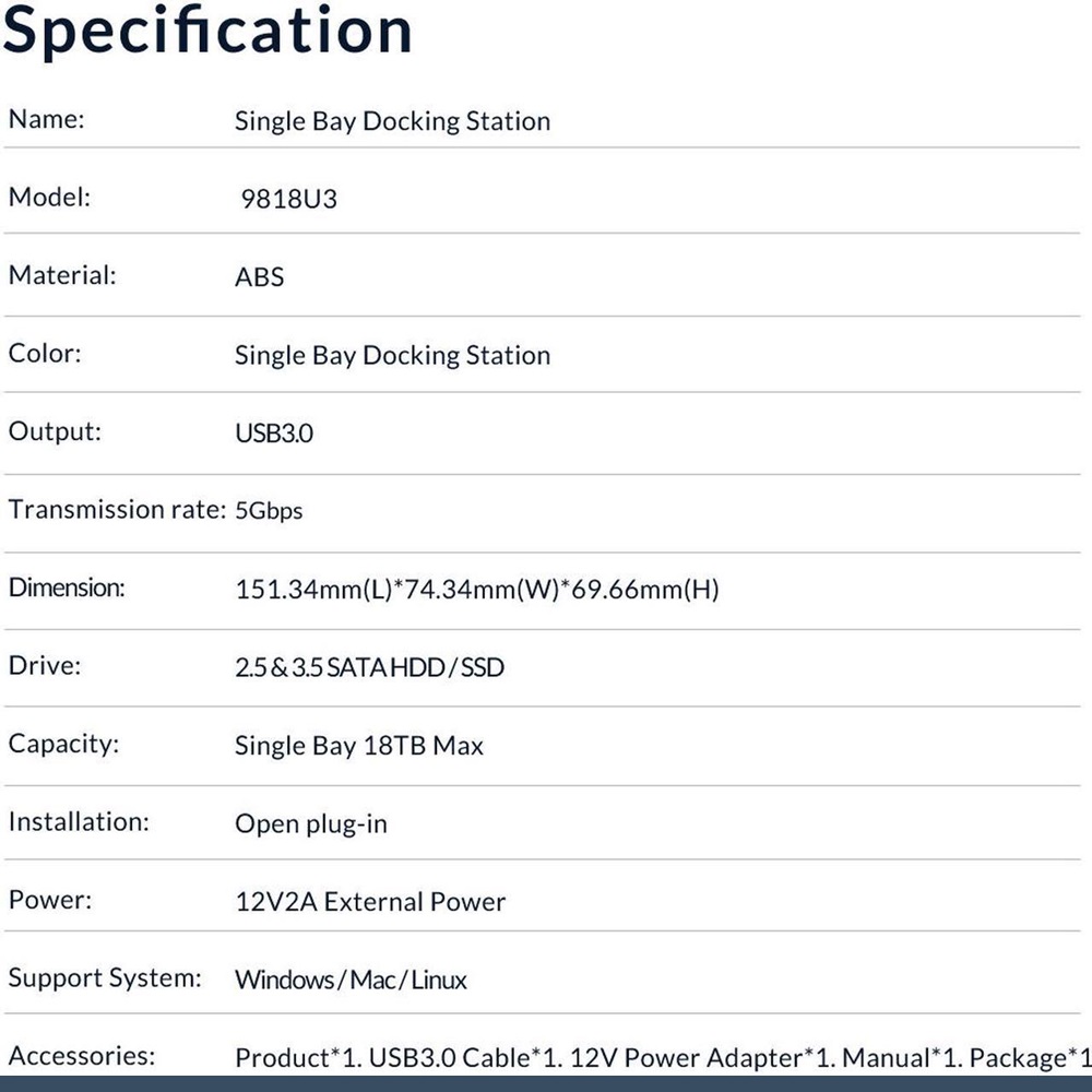 - أوريكو 9818U3 قاعدة محرك أقراص صلبة HDD/SSD مقاس 2.5/3.5 بوصة، USB 3.0 (الحد الأقصى 18 تيرابايت)