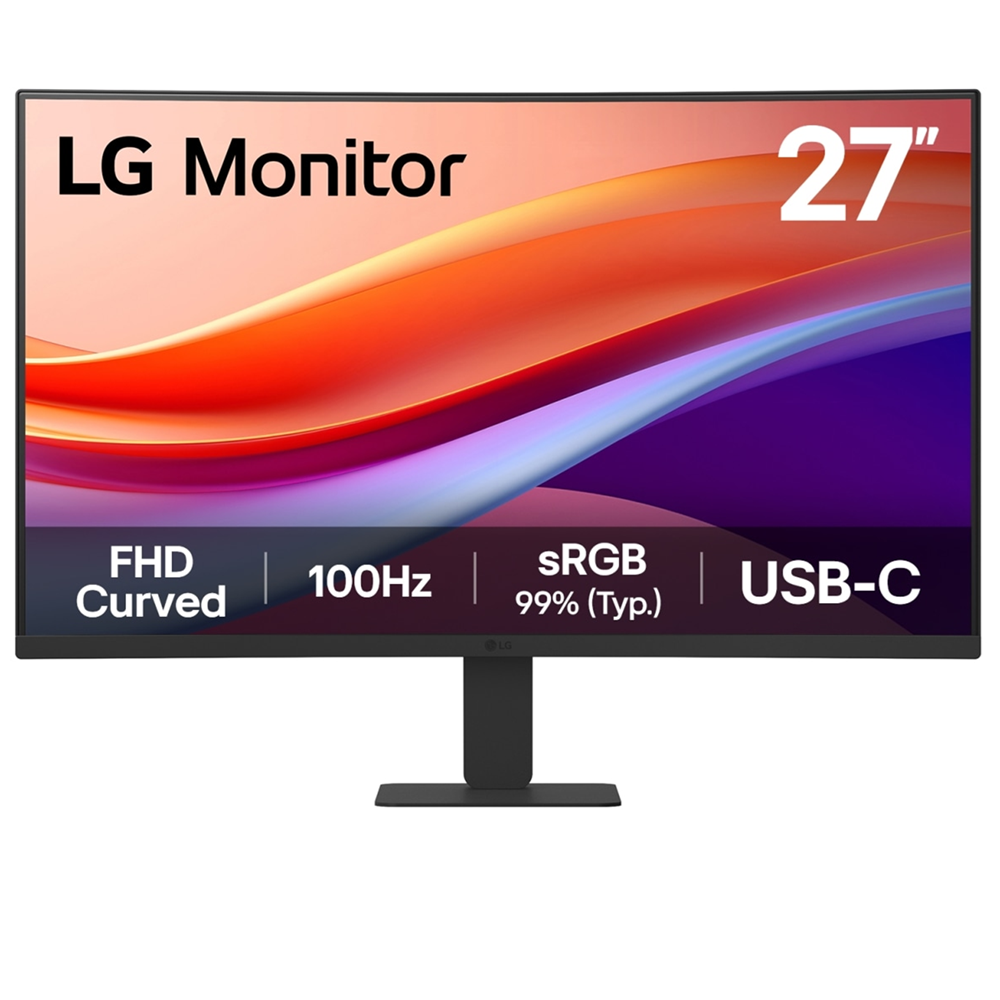إل جي شاشة 27 بوصة FHD VA منحنية معدل تحديث 100 هرتز زمن استجابة 5 مللي ثانية (GtG) USB-C لتوصيل الطاقة 15 واط تركيب على الحائط، تطبيق LG Switch، التبديل السريع