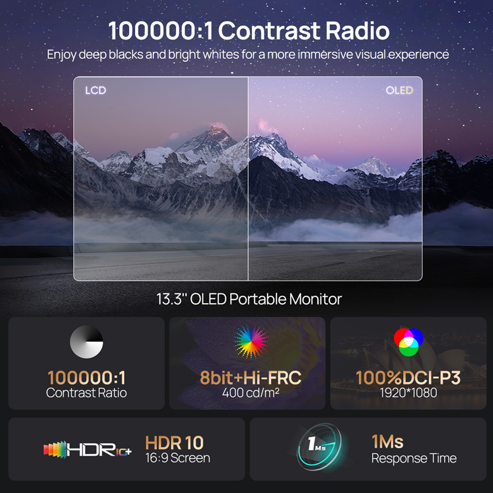 توفر لوحة OLED في شاشة Arzopa A3C Pro عمق ألوان 8-بت وإعادة إنتاج واقعية للصورة. ومع سطوع عالٍ يصل إلى 400 شمعة وتباين لا نهائي، يمكنك الاستمتاع برؤية ممتازة حتى في الغرف المضيئة. إضافة إلى ذلك، فإن التغطية الكاملة 100% لمساحة ألوان DCI-P3 ودعم HDR10 يجعلان الصور مليئة بالتفاصيل والألوان نابضة وطبيعية. وهذا يجعلها خيارًا رائعًا لمصممي الجرافيك والمصورين وكل من يقدّر أعلى مستويات جودة الصورة.