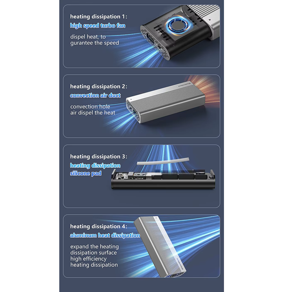 Built-in metal cooling vest and built-in fan,silicone thermal pad and all aluminium design , heat dissipation is fast.(NOTE:The fan is a 7000-rpm with an actual measured decibel of 40-60. The sound produced is about the same as a laptop cooling fan and will not affect your work.)