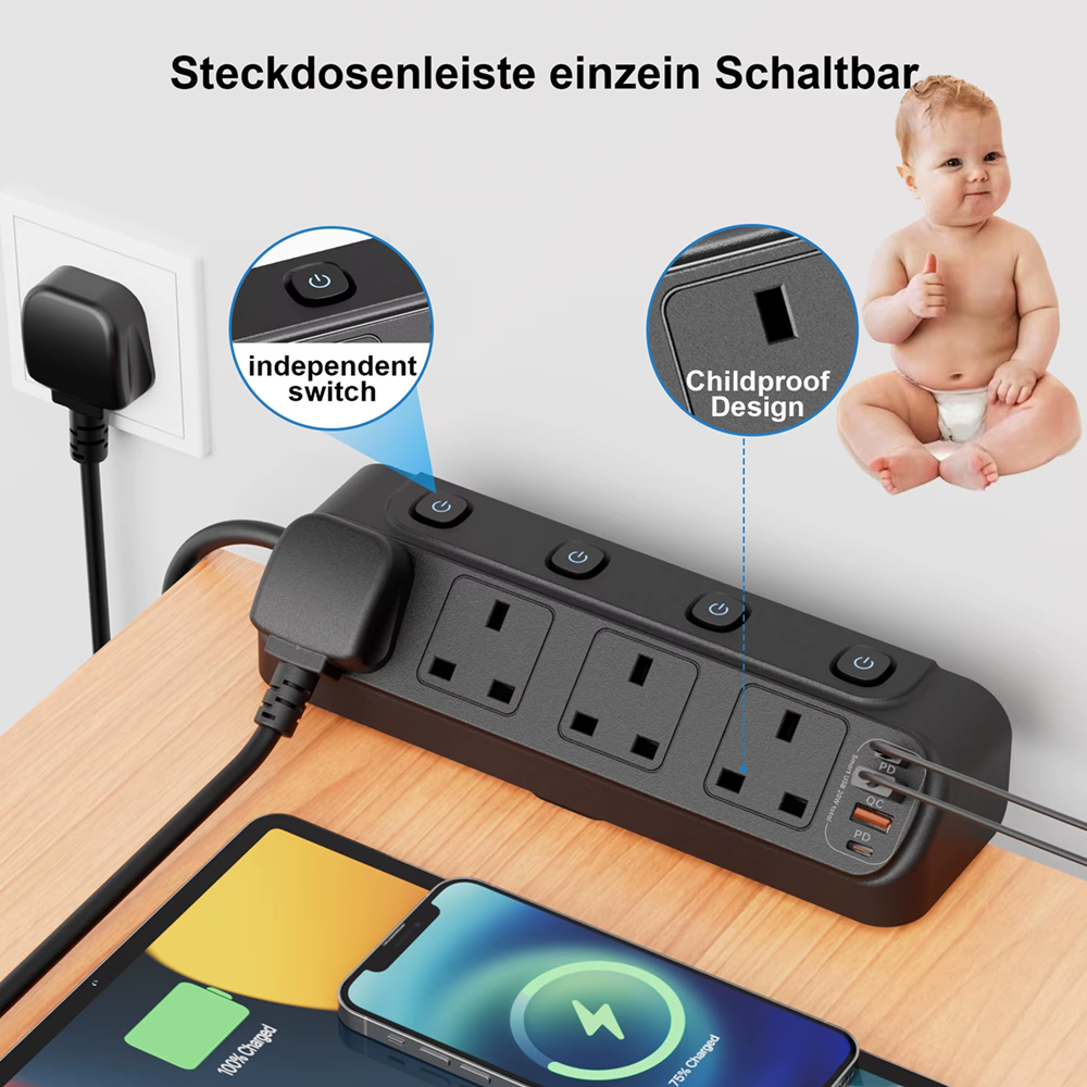 - PD20W Fast Charging Power: This multi plug extension features 4 USB slots, when charging through a single port, the USB-A port delivers up to 18W (QC), the USB-C port offers up to 20W (PD), it charge your iphone 16 from 0% to 50% in just 30 minutes. The PD20W fast charging supports up to 3A, ensuring your device powers up quickly without slowing you down.