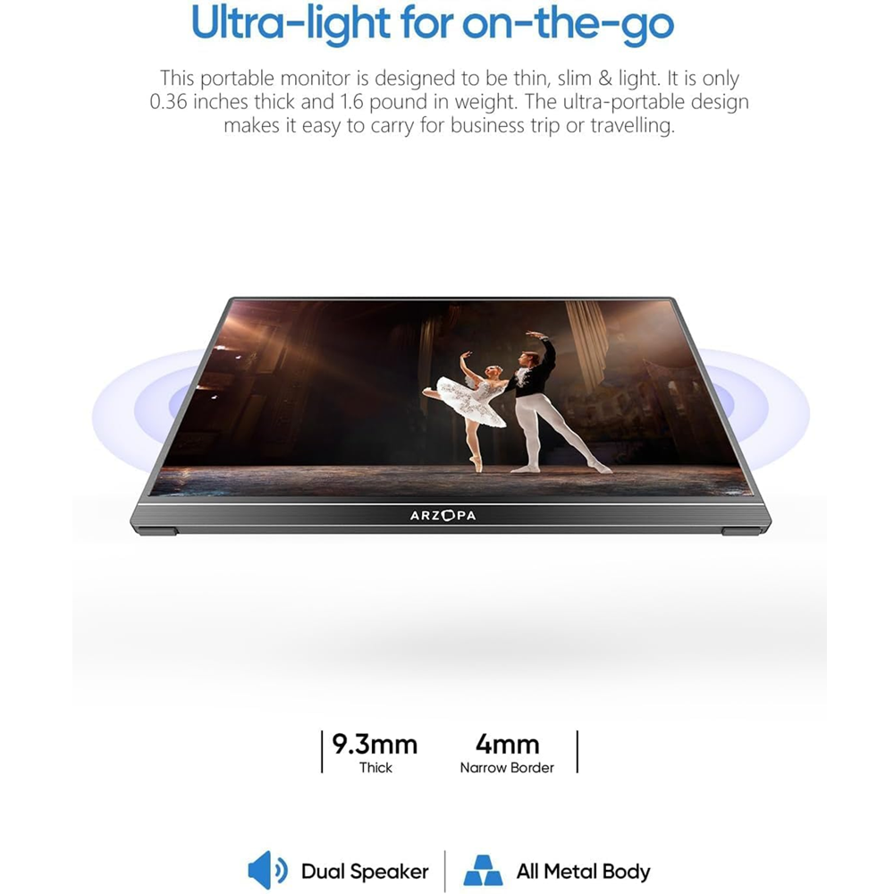 Arzopa 15.6 inch Slim, Light & Portable FHD (1920 x 1080), Panel Type : IPS 0.36 inches thick and 2.0 ponds in weight