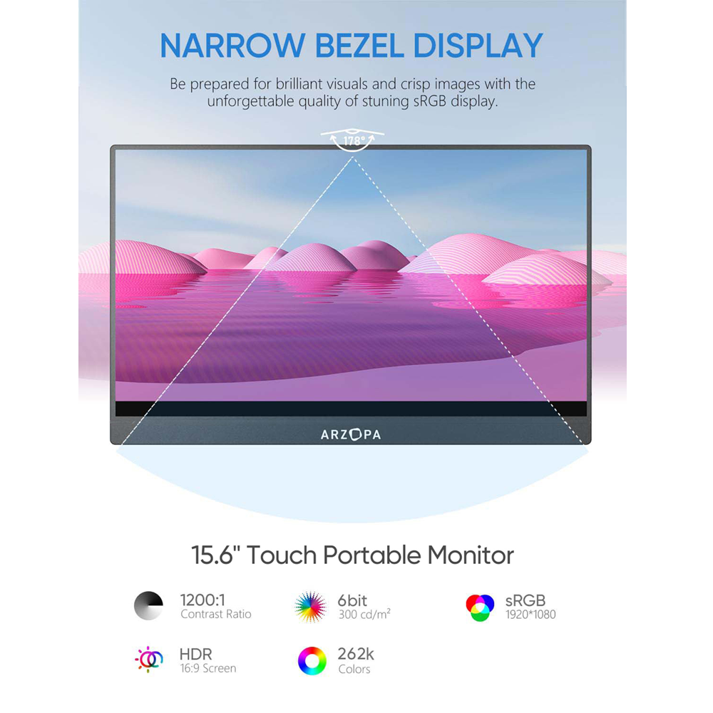 Arzopa 15.6” A1T Touchscreen IPS Ultra-Slim FHD Speakers Portable Monitor, USB-C, Mini HDMI